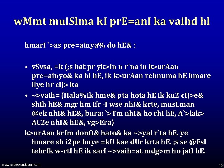 w. Mmt mui. Slma k. I pr. E=an. I ka vaihd hl hmar. I `>as pre=ainya% do h. E& : • v. Svsa, =k (; s bat pr yk>In n r`na in k>ur. Aan pre=ainyo& ka hl h. E, ik k>ur. Aan rehnuma h. E hmare ilye hr c. Ij> ka • ~>vaih= (Hala%ik hme& pta hota h. E ik ku 2 c. Ij>e& sh. Ih h. E& mgr hm ifr -I wse nh. I& krte, mus. Lman @ek nh. I& h. E&, bura: `>Tm nh. I& ho rh. I h. E, A`>lak> AC 2 e nh. I& h. E&, vg>Era) k>ur. Aan kr. Im don. O& bato& ka ~>yal r`ta h. E. ye hmare sb i 2 pe huye =k. U kae d. Ur krta h. E. ; s se @Es. I tehr. Ik w-rt. I h. E ik sar. I ~>vaih=at mdg>m ho jat. I h. E. www. understandquran. com 12