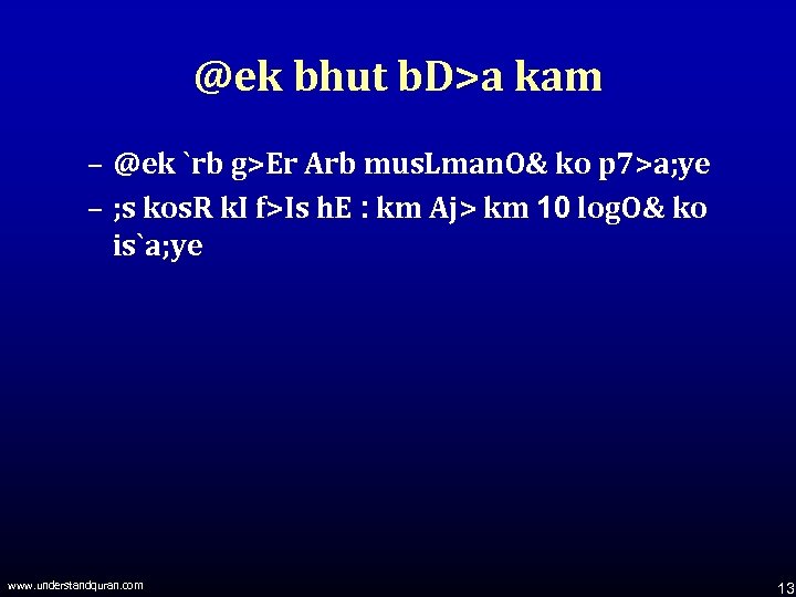 @ek bhut b. D>a kam – @ek `rb g>Er Arb mus. Lman. O& ko p 7>a; ye – ; s kos. R k. I f>Is h. E : km Aj> km 10 log. O& ko is`a; ye www. understandquran. com 13