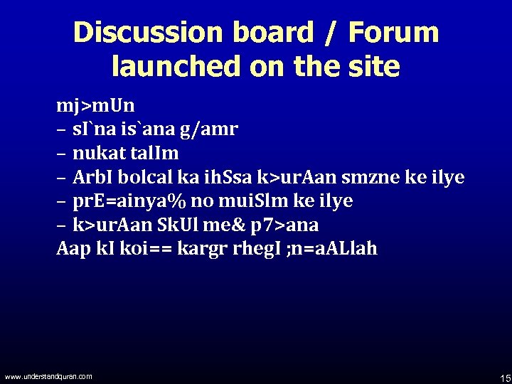 Discussion board / Forum launched on the site mj>m. Un – s. I`na is`ana g/amr – nukat tal. Im – Arb. I bolcal ka ih. Ssa k>ur. Aan smzne ke ilye – pr. E=ainya% no mui. Slm ke ilye – k>ur. Aan Sk. Ul me& p 7>ana Aap k. I koi== kargr rheg. I ; n=a. ALlah www. understandquran. com 15