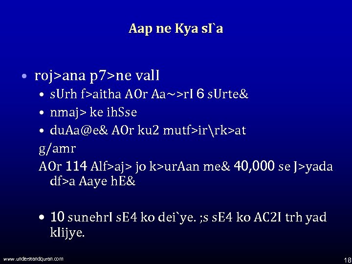 Aap ne Kya s. I`a • roj>ana p 7>ne val. I • s. Urh f>aitha AOr Aa~>r. I 6 s. Urte& • nmaj> ke ih. Sse • du. Aa@e& AOr ku 2 mutf>irrk>at g/amr AOr 114 Alf>aj> jo k>ur. Aan me& 40, 000 se J>yada df>a Aaye h. E& • 10 sunehr. I s. E 4 ko dei`ye. ; s s. E 4 ko AC 2 I trh yad k. Iijye. www. understandquran. com 18