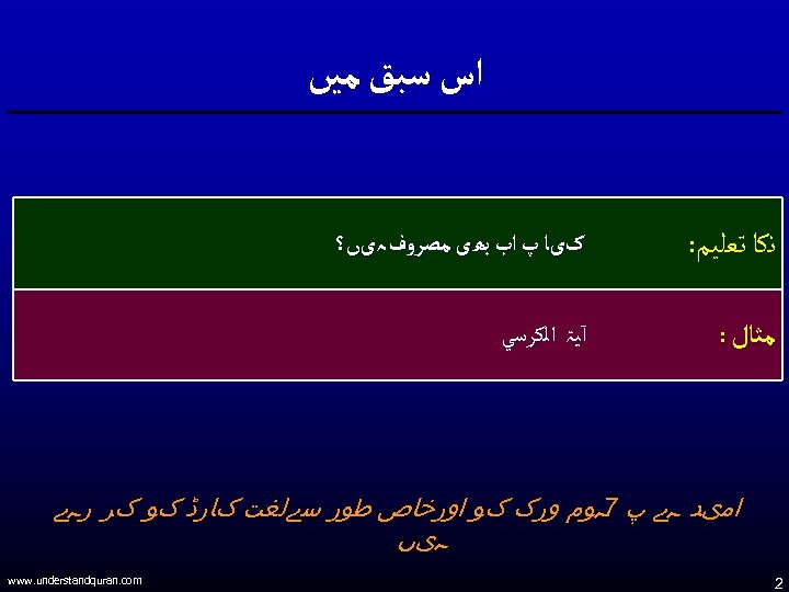 ﺍﺱ ﺳﺒﻖ ﻣﻴں ﻧﻜﺎ ﺗﻌﻠﻴﻢ: کیﺎ پ ﺍﺏ ﺑھی ﻣﺼﺮﻭﻑ ہیں؟ ﻣﺜﺎﻝ : آﻴۃ ﺍﻟﻜﺮﺳﻲ ﺍﻣیﺪ ہے پ 7ہﻮﻡ ﻭﺭک کﻮ ﺍﻭﺭﺧﺎﺹ ﻃﻮﺭ ﺳےﻟﻐﺖ کﺎﺭڈ کﻮ کﺮ ﺭہے ہیں 2 www. understandquran. com