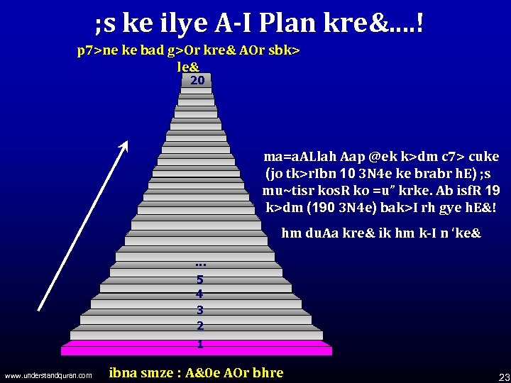 ; s ke ilye A-I Plan kre&. . ! p 7>ne ke bad g>Or kre& AOr sbk> le& 20 ma=a. ALlah Aap @ek k>dm c 7> cuke (jo tk>r. Ibn 10 3 N 4 e ke brabr h. E) ; s mu~tisr kos. R ko =u” krke. Ab isf. R 19 k>dm (190 3 N 4 e) bak>I rh gye h. E&! hm du. Aa kre& ik hm k-I n ‘ke& … 5 4 3 2 1 www. understandquran. com ibna smze : A&0 e AOr bhre 23