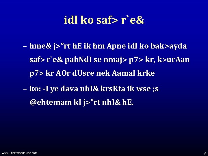 idl ko saf> r`e& – hme& j>”rt h. E ik hm Apne idl ko bak>ayda saf> r`e& pab. Nd. I se nmaj> p 7> kr, k>ur. Aan p 7> kr AOr d. Usre nek Aamal krke – ko: -I ye dava nh. I& krs. Kta ik wse ; s @ehtemam k. I j>”rt nh. I& h. E. www. understandquran. com 6