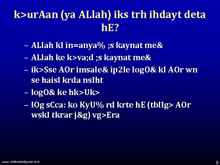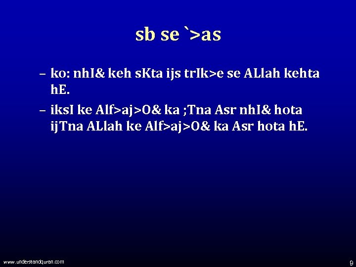 k>ur. Aan (ya ALlah) iks trh ihdayt deta h. E? – ALlah k. I in=anya% ; s kaynat me& – ALlah ke k>va; d ; s kaynat me& – ik>Sse AOr imsale& ip 2 le log. O& k. I AOr wn se haisl krda ns. Iht – log. O& ke hk>Uk> – l. Og s. Cca: ko Ky. U% rd krte h. E (tbl. Ig> AOr wsk. I tkrar j&g) vg>Era www. understandquran. com 8