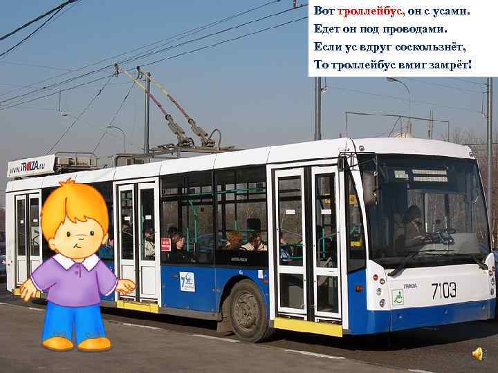 Вот троллейбус, он с усами. Едет он под проводами. Если ус вдруг соскользнёт, То троллейбус вмиг замрёт!