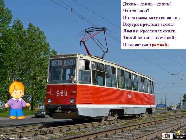 Дзинь – дзинь! Что за звон? По рельсам катится вагон. Внутри креслица стоят, Люди в креслицах сидят. Такой вагон, запоминай, Называется трамвай.