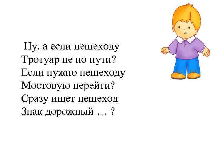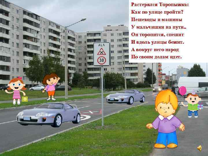 Растерялся Торопыжка: Как по улице пройти? Пешеходы и машины У мальчишки на пути. . Он торопится, спешит И вдоль улицы бежит. А вокруг него народ По своим делам идет.