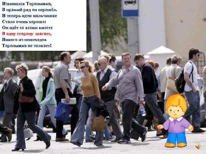 Извинился Торопыжка, В правый ряд он перешёл. И теперь идти мальчишке Стало очень хорошо: Он идёт со всеми вместе В одну сторону шагает, Никого из пешеходов Торопыжка не толкает!