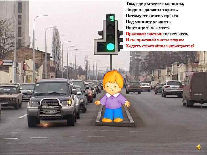 Там, где движутся машины, Люди не должны ходить. Потому что очень просто Под машину угодить. На улице такое место Проезжей частью называется, И по проезжей части людям Ходить строжайше запрещается!