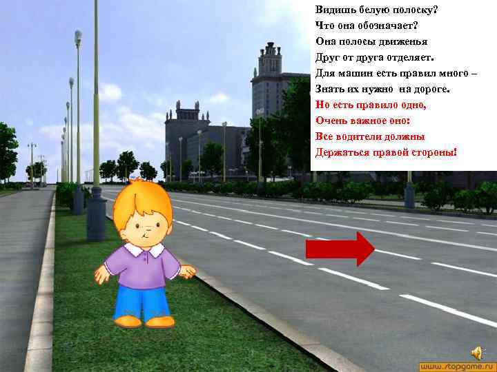 Видишь белую полоску? Что она обозначает? Она полосы движенья Друг от друга отделяет. Для машин есть правил много – Знать их нужно на дороге. Но есть правило одно, Очень важное оно: Все водители должны Держаться правой стороны!