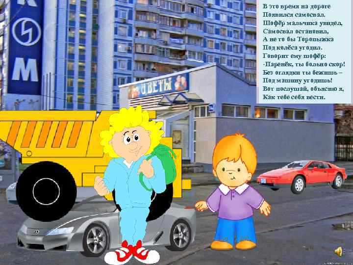 Как пройти через дорогу В это время на дороге Возле края тротуара Торопыжкесамосвал. Появился наш стоит. Торопыжка в магазин? Очень, очень, много Шофёр мальчика увидел, На высокий дом красивый На его пути глядит. Самосвал остановил, Через улицумашин! Может, стоит расспросить, А не то бы Торопыжка Там цветочный магазин Где иколёса угодил. Под как переходить? На всей улице – один! Торопыжка Говорит ему шофёр: Очень хочетне такой! Он на всё махнул купить. -Паренёк, ты больно скор! Машеньке цветы рукой И через дорогу дне рожденья Без потом на прямо Чтобоглядки ты бежишь – К магазину побежал. Под машину удивить. Всех приятно угодишь! Вот послушай, объясню я, Как тебе себя вести.