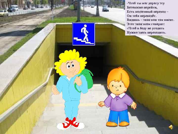 -Чтоб ты мог дорогу эту Безопасно перейти, Есть подземный переход – Он тебя переведёт. Видишь – знак вон там висит. Этот знак всем говорит: «Чтоб в беду не угодить Нужно здесь переходить.