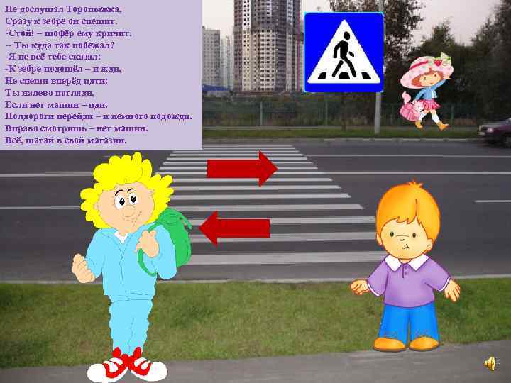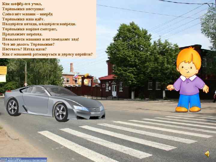 Как шофёр его учил, Торопыжка поступил: Слева нет машин – вперёд Торопыжка наш идёт. Полдороги позади, полдороги впереди. Торопыжка вправо смотрит, Продолжает переход. Появляется машина и не замедляет ход! Что же делать Торопыжке? Постоять? Назад идти? Как с машиной разминуться и дорогу перейти?