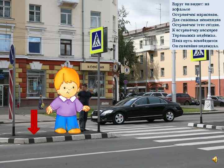 Вдруг он видит: на асфальте Островочек нарисован. Для спасенья пешеходов Островочек этот создан. К островочку поскорее Торопыжка подбежал. Пока путь освободится Он спокойно подождал.