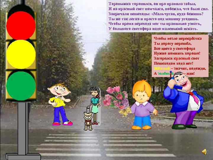 Торопыжка торопился, он про правила забыл, И на красный свет помчался, побежал, что было сил. Закричали пешеходы: «Мальчуган, куда бежишь? Ты же так легко и просто под машину угодишь. Чтобы время перехода мог ты правильно узнать, У большого светофора надо маленький искать. Чтобы возле перекрёстка Ты дорогу перешёл, Все цвета у светофора Нужно помнить хорошо! Загорелся красный свет Пешеходам хода нет! Жёлтый – значит, подожди, А зелёный свет – иди!