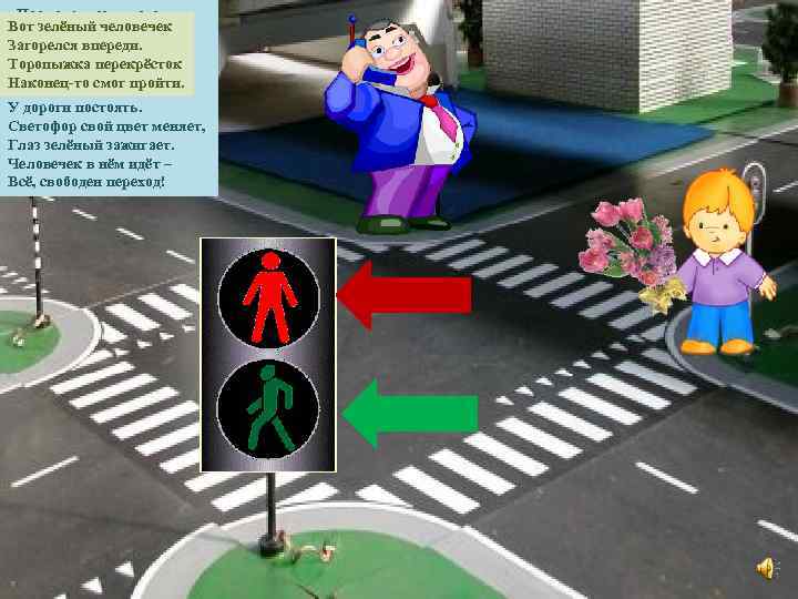- Посмотри-ка, у него Вот зелёный человечек Есть два глазика всего: Загорелся впереди. горит, Если красный глаз Торопыжка перекрёсток Человечек в нём стоит. Наконец-то смог пройти. Значит, надо переждать, У дороги постоять. Светофор свой цвет меняет, Глаз зелёный зажигает. Человечек в нём идёт – Всё, свободен переход!