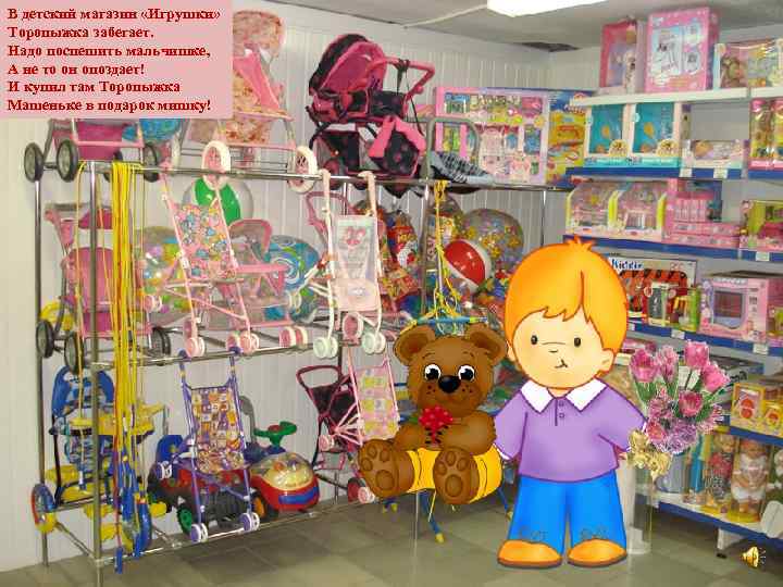 В детский магазин «Игрушки» Торопыжка забегает. Надо поспешить мальчишке, А не то он опоздает! И купил там Торопыжка Машеньке в подарок мишку!