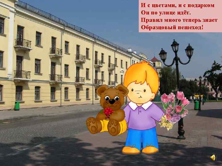 И с цветами, и с подарком Он по улице идёт. Правил много теперь знает Образцовый пешеход!