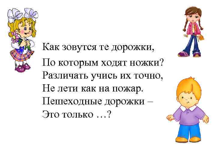Как зовутся те дорожки, По которым ходят ножки? Различать учись их точно, Не лети как на пожар. Пешеходные дорожки – Это только …?