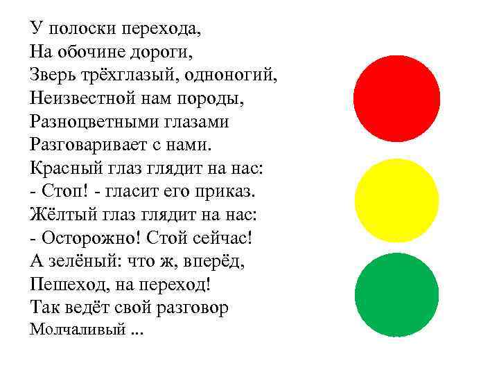 У полоски перехода, На обочине дороги, Зверь трёхглазый, одноногий, Неизвестной нам породы, Разноцветными глазами Разговаривает с нами. Красный глаз глядит на нас: - Стоп! - гласит его приказ. Жёлтый глаз глядит на нас: - Осторожно! Стой сейчас! А зелёный: что ж, вперёд, Пешеход, на переход! Так ведёт свой разговор Молчаливый. . .