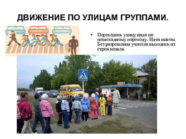 ДВИЖЕНИЕ ПО УЛИЦАМ ГРУППАМИ. • Переходить улицу надо по пешеходному переходу. Идти шагом. Без разрешения учителя выходить из строя нельзя.