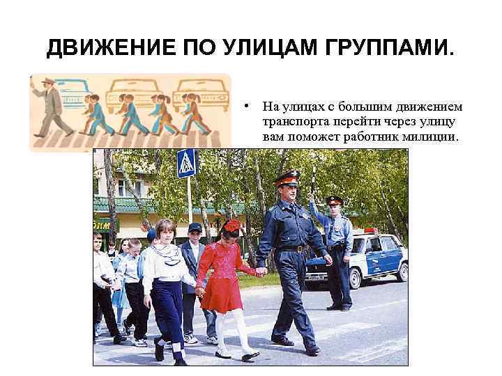 ДВИЖЕНИЕ ПО УЛИЦАМ ГРУППАМИ. • На улицах с большим движением транспорта перейти через улицу вам поможет работник милиции.