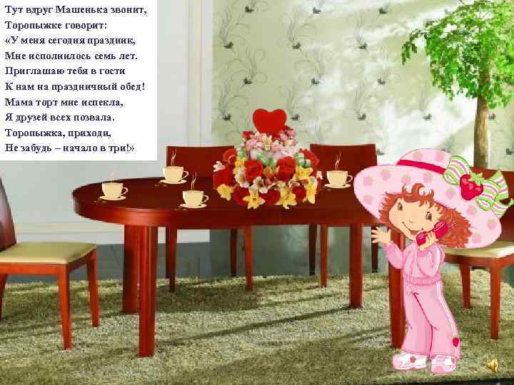 Тут вдруг Машенька звонит, Торопыжке говорит: «У меня сегодня праздник, Мне исполнилось семь лет. Приглашаю тебя в гости К нам на праздничный обед! Мама торт мне испекла, Я друзей всех позвала. Торопыжка, приходи, Не забудь – начало в три!»