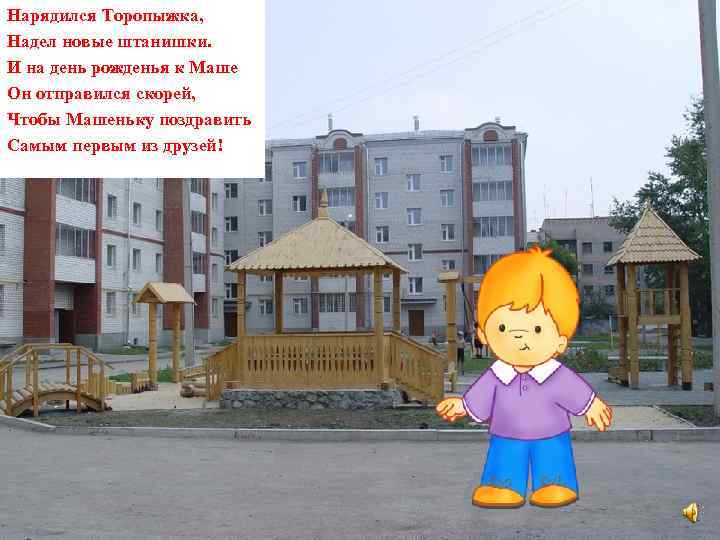 Нарядился Торопыжка, Надел новые штанишки. И на день рожденья к Маше Он отправился скорей, Чтобы Машеньку поздравить Самым первым из друзей!