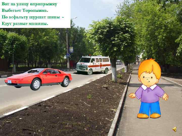 Вот на улицу вприпрыжку Выбегает Торопыжка. По асфальту шуршат шины Едут разные машины.