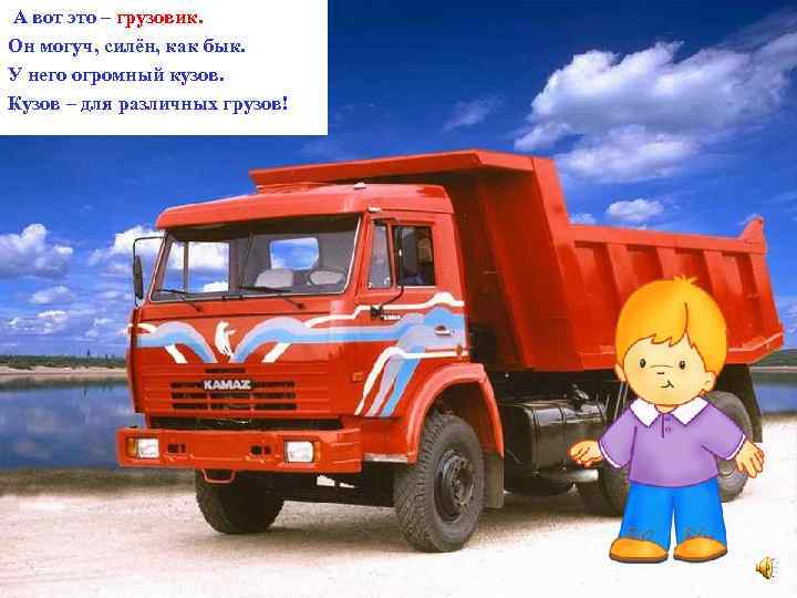 А вот это – грузовик. Он могуч, силён, как бык. У него огромный кузов. Кузов – для различных грузов!