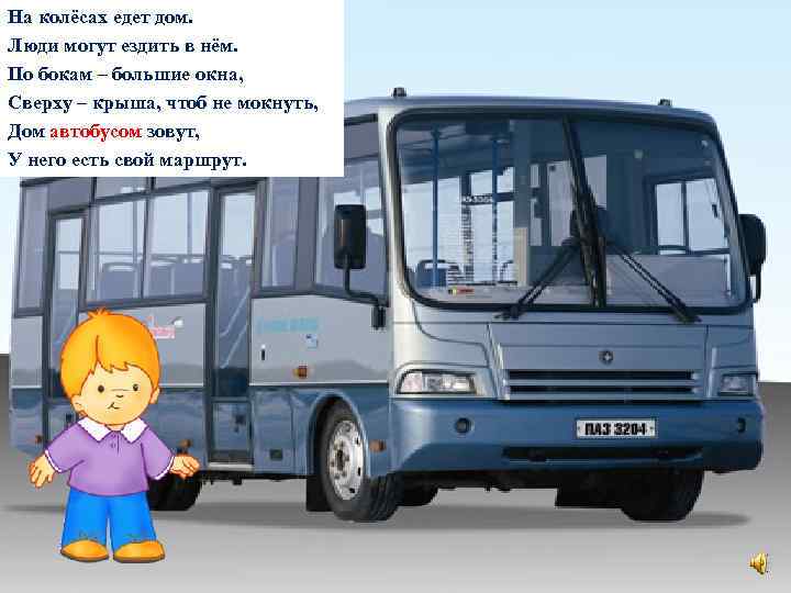 На колёсах едет дом. Люди могут ездить в нём. По бокам – большие окна, Сверху – крыша, чтоб не мокнуть, Дом автобусом зовут, У него есть свой маршрут.