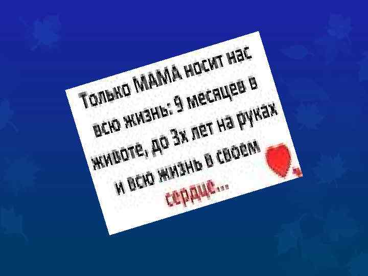 ДОРОГОЙ МАМОЧКЕ!!! Всё , что происходит с нами, И обиды к ней идем делить, Мы как-то странно делим И морщинки ей рисуем сами, пополам: Позабыв прощенья попросить… Если радость- празднуем с друзьями, А с бедой приходим к МАТЕРЯМ. Заняты работой и делами День за днем в потоке суеты Мы не часто думаем о маме, Слишком редко дарим ей цветы. А мама всё равно нас ЛЮБИТ, Чтобы не случилось- не предаст, Всё простит, обиды позабудет, Руку, душу, сердце-ВСЁ ОТДАСТ!!!!!