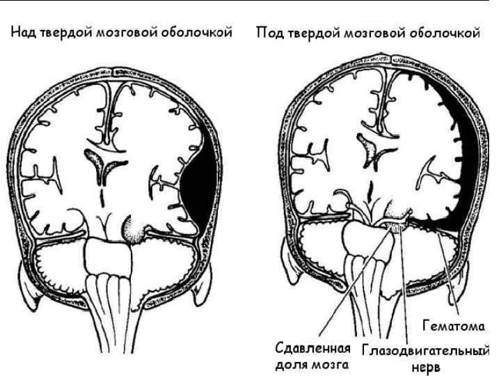 Эпидуральды гематома линзотәрізді формаға айналады, қалыңдығы 4 см – ге жетеді. Нәтижесінде бас миы қысылуы дамиды, кейін айқын гипертензионды – дислокационды синдром пайда болады. Науқаста бұл кезде бас ауыруы, бас айналуы, әлсіздік, психомоторлық қозулар, көп реттік құсулар болады. Эпидуральды гематомамен науқас та бас миы қысылу синдромы тез болады, сондықтан коматозды жағдай 10 минуттан кейін болады.