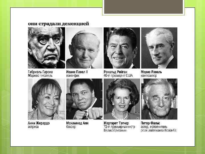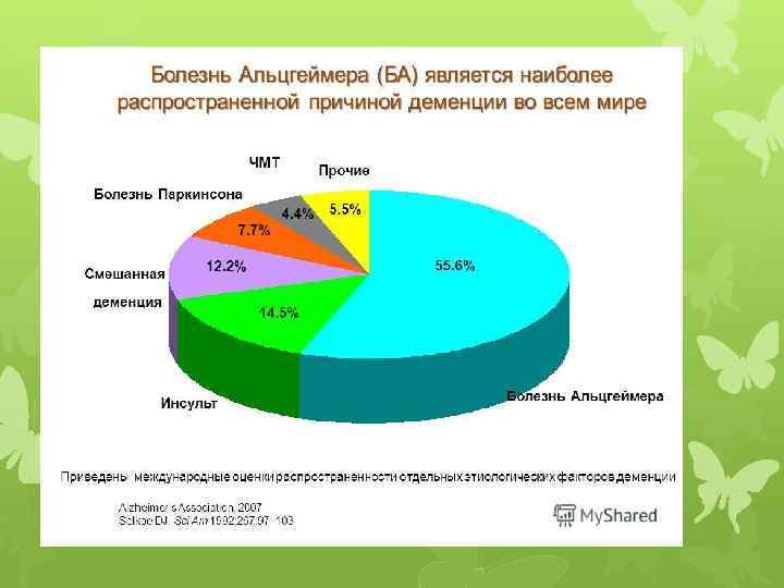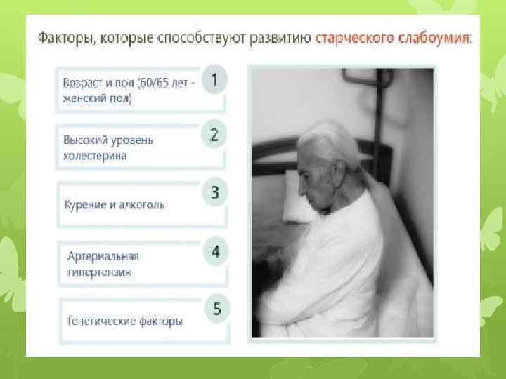 ЧТО ЯВЛЯЕТСЯ ПРИЧИНОЙ СЛАБОУМИЯ? Самый простой ответ: “мы пока не знаем!» Все виды слабоумия являются следствием гибели нервных клеток / либо отсутствием взаимодействия между ними. Человеческий мозг — это сложная и очень замысловатая «машина» , многие фак- торы могут влиять на её функции. Исследователи проработали многие из этих функций, но они пока не смогли сложить вместе кусочки этого пазла, чтобы сформировать полную картину того, как развивается слабоумие.