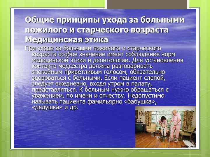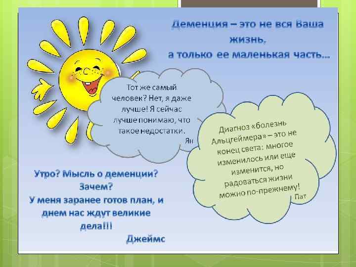 Будьте добры к больному, поддерживайте его, не говорите с больным свысока; Не ругайте и не критикуйте больных; Никогда не говорите о больном в 3 -м лице, особенно в его присутствии. Вовлекайте больного в обсуждения; Даже если Вам не понятен смысл того, что говорит больной, постарайтесь его понять; Людям с деменцией тяжело выбирать. Постарайтесь сделать выбор максимально простым. Задавайте вопросы, на которые можно ответить «да» или «нет» .