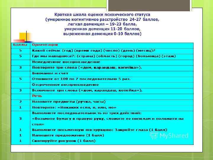 Степени тяжести деменции Лёгкая. Хотя работа и социальная деятельность существенно нарушены, способность к самостоятельной жизни сохраняется, с соблюдением правил личной гигиены и относительной сохранностью критики. Умеренная. Предоставлять больного самому себе рискованно, требуется определенный надзор. Тяжёлая. Повседневная деятельность настолько нарушена, что требуется постоянный надзор (например, больной не в состоянии выполнять правила личной гигиены, не понимает, что ему говорят и сам не говорит).