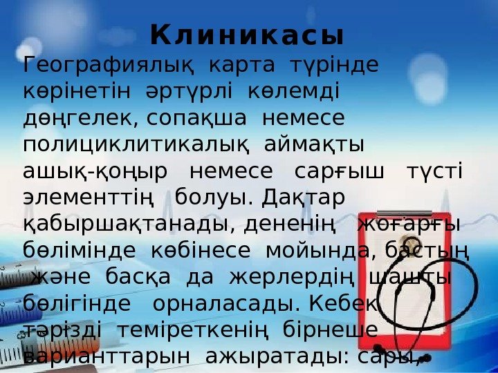 К л и н и к а с ы Географиялық карта түрінде көрінетін әртүрлі көлемді дөңгелек, сопақша немесе полициклитикалық аймақты ашық-қоңыр немесе сарғыш түсті элементтің болуы. Дақтар қабыршақтанады, дененің жоғарғы бөлімінде көбінесе мойында, бастың және басқа да жерлердің шашты бөлігінде орналасады. Кебек тәрізді теміреткенің бірнеше варианттарын ажыратады: сары, қара, ахромды.