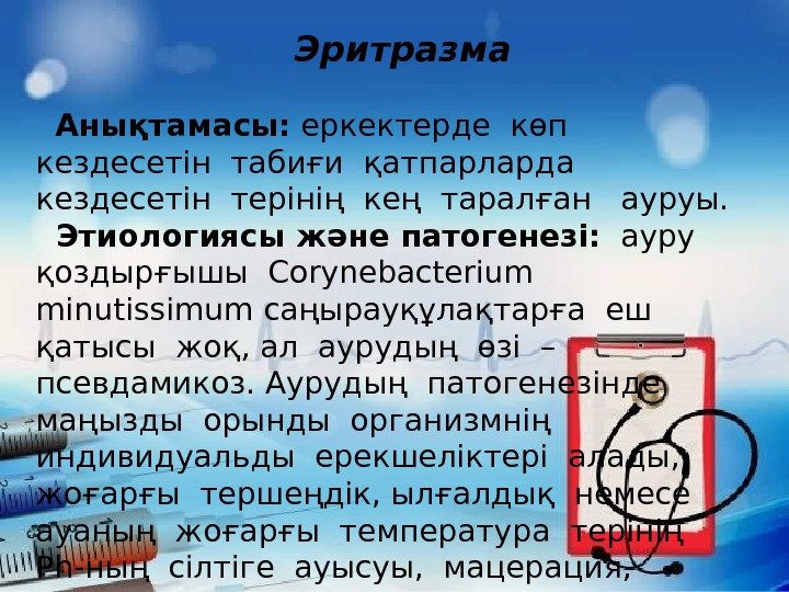 Эритразма Анықтамасы: еркектерде көп кездесетін табиғи қатпарларда кездесетін терінің кең таралған ауруы. Этиологиясы және патогенезі: ауру қоздырғышы Corynebacterium minutissimum саңырауқұлақтарға еш қатысы жоқ, ал аурудың өзі – псевдамикоз. Аурудың патогенезінде маңызды орынды организмнің индивидуальды ерекшеліктері алады, жоғарғы тершеңдік, ылғалдық немесе ауаның жоғарғы температура терінің Рһ-ның сілтіге ауысуы, мацерация, қажалу. Инфекциялық киім, ванна, жыныстық жолмен берілуі мүмкін.