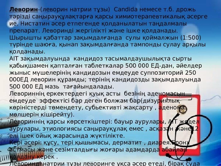 Леворин -(леворин натрии тұзы) Сandida немесе т. б. дрожь тәрізді саңырауқұлақтарға қарсы химиотерапевтикалық әсерге ие. Нистатин әсер етпегенде қолданылатын таңдалмалы препарат. Леворинді жергілікті және ішке қолданады. Шырышты қабаттар зақымдалғанда сулы қоймалжын (1: 500) түрінде шаюға, қынап зақымдалғанда тампонды сулау арқылы қолданады. АІТ зақымдалуында кандидоз тасымалдаушылықта сырты қабықшамен қапталған таблеткалар 500 000 ЕД-дан, әйелдер жыныс мүшелерінің кандидозын емдеуде суппозиторий 250 000 ЕД леворин құрамды; терінің кандидозды зақымдалуында 500 000 ЕД мазь тағайындалады. Левориннің еркектердегі қуық асты безінің аденомасын емдеуде эффектісі бар деген болжам бар(дизуриялық көріністерді төмендету, субьективті жақсарту , аденома мөлшерін кішірейту). Левориннің қарсы көрсеткіштері: бауыр аурулары, АІТ жедел аурулары, этиологиясы саңырауқұлақ емес , асқазан және 12 елі ішек ойық жарасында жүктілікте. Кері әсері: құсу, тері қышымасы, дерматит , диарея. Бронх астмасы және сезімталдығы жоғары адамдарда абайлап қолдану керек. Леворинді натрии тұзы леворинге ұқса әсер етеді, бірақ суда еріткенде коллойд түзеді, ал өкпенің кандидозды зақымдалуы кезінде қолданады( ингаляция арқылы енгізеді). Леворин мен нистатин мукороздарда, риноспориноздарда , дермофитияларда, керотомикоздарда эффективті емес.