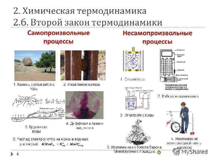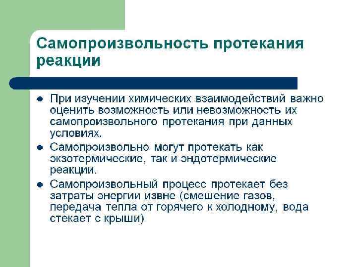 ВЫВОДЫ 1. Направление химической реакции определяется двумя факторами: стремлением к уменьшению внутренней энергии с выделением энергии и стремлением к максимальному беспорядку, т. е. к увеличению энтропии. 2. Эндотермическую реакцию можно заставить идти, если она сопровождается увеличением энтропии. 3. Энтропия увеличивается при повышении температуры и особенно сильно при фазовых переходах: твердое – жидкое, твердое – газообразное. 4. Чем выше температура, при которой проводят реакцию, тем большее значение будет иметь энтропийный фактор по сравнению с энергетическим.