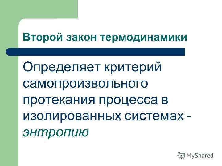 ИЗМЕНЕНИЕ ЭНТРОПИИ Процессы, для которых ΔS>0: 1) Расширение газов; 2) Фазовые превращения, в ходе которых вещество переходит от твердого к жидкому и газообразному состоянию; 3) Растворение кристаллических веществ. Процессы, для которых ΔS<0: 1) Сжатие газов; 2) Конденсация и кристаллизация веществ. В ходе химической реакции ΔS>0, если увеличивается объем системы. Если объем системы в ходе реакции уменьшается, то ΔS<0.