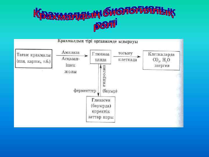 Крахмалдың қасиеттері • Маңызды қасиеті қышқыл әсерінен гидролизденуі. Ол бірнеше сатыда жүреді. Гидролизденудің соңғы өнімі ά-глюкоза. (C 6 H 10 O 5)→(C 6 H 10 O 5)x→(C 12 H 22 O 11)→C 6 H 11 O 6 Крахмал декстриндер мальтоза L-глюкоза Крахмал құрамындағы альдегид тобы гликольдік байланысқа түскендіктен, аммактағы күміс /І/ оксиді ерітіндісімен әрекеттеспейді. Крахмалды анықтау үшін иод ерітіндісі қолданылады. Ол крахмалды көк түске бояйды.