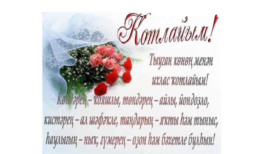 Сабыр ҙа һин, ябай, кешелекле, Ҡылған эшең — бары изгелек. Шатлыҡтарҙа үтһен һинең көндәр, Бәхеттәрең булһын ғүмерлек. Хоҙай һиңә сәләмәтлек бирһен, Беҙҙән һиңә яҡты теләктәр. Балҡып торған йөҙкәйеңде күреп, Ҡыуанһындар беҙҙең йөрәктәр