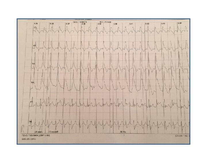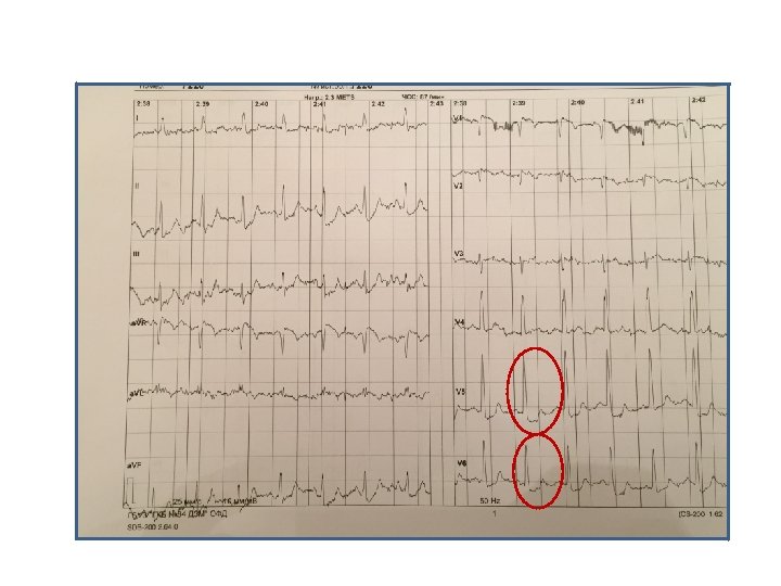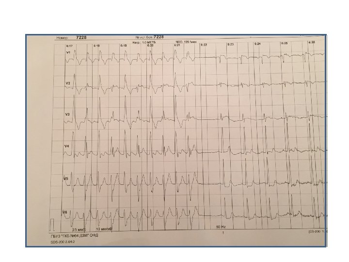 Снижение АД 1. Прекратить нагрузку 2. Уложить пациента и приподнять ноги 3. Контроль ЭКГ и АД (ежеминутно) 4. 5. При ангинозных болях и АД менее 90/60 мм рт. ст. лучше не использовать нитраты в течение первых 3 минут. Можно ввести анальгетики в/в При отсутствии положительной