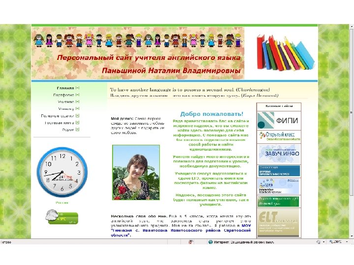 1. Главная страница • Что необходимо показать на главной странице: - свою фотографию (поработайте с ней в любом графическом редакторе, так, что бы она хорошо смотрелось, была, как мы говорим, «качественной» ). Желательно снимок сделать на фоне классного уголка, классной доски, школы. (Ещё лучше с цветами) В кадре желательно разместить одну треть роста. Например: - о себе ( ФИО, образование, кв. категория, стаж. ) - девиз, кредо (краткое изречение, выражающее идею деятельности. Личное убеждение, основа мировоззрения человека. ) - обращение к посетителям сайта (приветствие, краткое знакомство с рубриками сайта, приглашение к сотрудничеству); - электронный почтовый адрес, ICQ, Skype, Тел. : и пр. (по желанию); - дата обновления сайта (дата в обычном прямоугольнике, сделаем сами); - счётчики (посещения сайта, счётчик даты, часы, календарь, погода) и фреймы