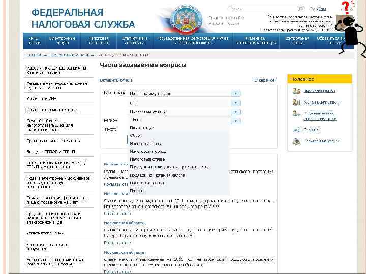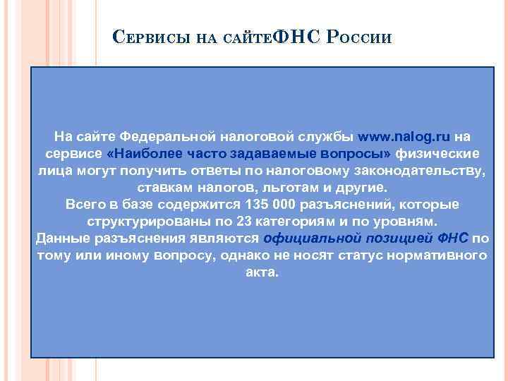 СЕРВИСЫ НА САЙТЕФНС РОССИИ На сайте Федеральной налоговой службы www. nalog. ru на сервисе «Наиболее часто задаваемые вопросы» физические лица могут получить ответы по налоговому законодательству, ставкам налогов, льготам и другие. Всего в базе содержится 135 000 разъяснений, которые структурированы по 23 категориям и по уровням. Данные разъяснения являются официальной позицией ФНС по тому или иному вопросу, однако не носят статус нормативного акта.