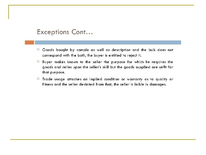 Section 38. Instalment Deliveries… contd. n n n Examples 1. Sale of 25 tons of pepper October /November shipment. The sellers shipped 20 tons in November and 5 tons in December. The buyers were entitled to reject the whole 25 tons. Reuter Vs. Sala (1879) 2. Sale of 200 -300 tons of coal to be shipped as early as possible by a named ship or other vessel. The named ship was not available and the seller shipped 152 tons on another ship, informing the buyer that he had done so and that he had drawn on him for the price and proposing to ship the remainder later. The buyer made no reply to this communication. The ship was lost. In an action by the seller for the price it was held that the buyer had impliedly assented to the shipment of the smaller quantity as an instalment and was liable to pay for it. Riichardson Vs. Dunn (1841)