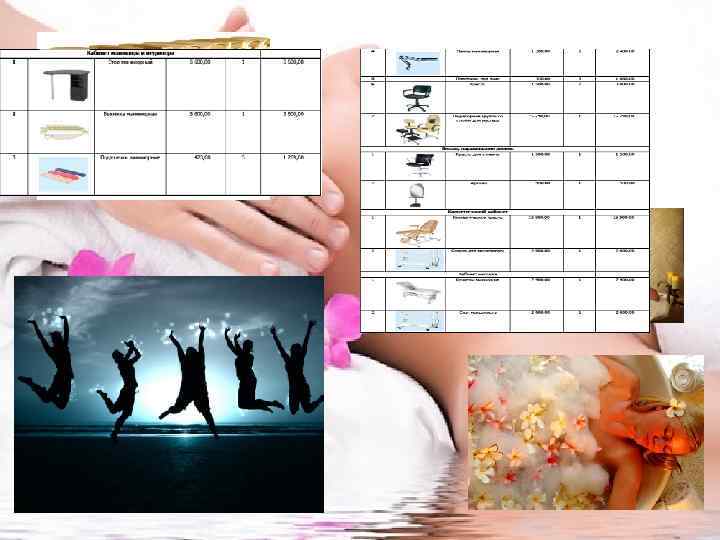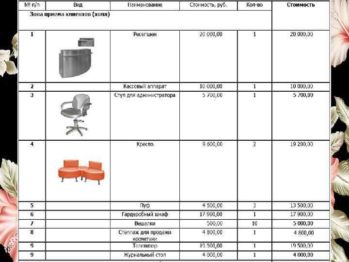 ИНВЕСТИЦИОННЫЙ ПЛАН Название статьи расходов Сумма Разрешительные документы 25 000 Аренда салона (в месяц) Проектирование (дизайн), ремонт салона 166 666 400 000 Покупка мебели 250 000 Покупка оборудования, материалов, средств, прочие расходы Маркетинговые мероприятия(1 -ый месяц) Заработная плата (за месяц) Коммунальные услуги Итого: 115 112 49 500 163 000 13 250 1 182 528