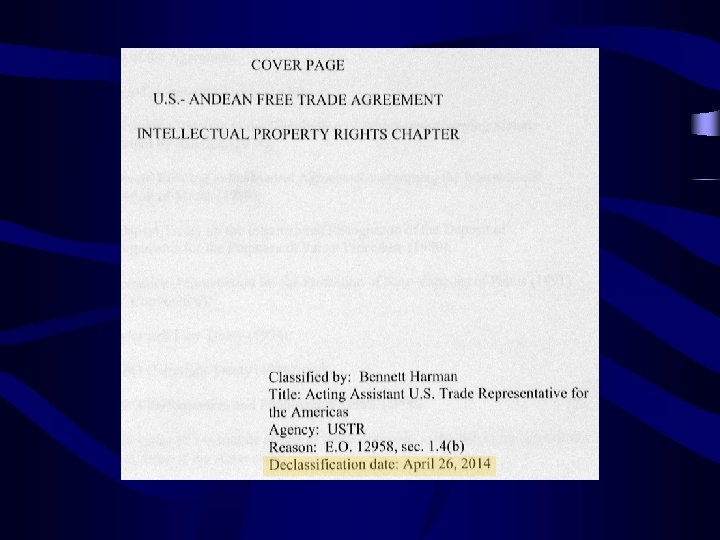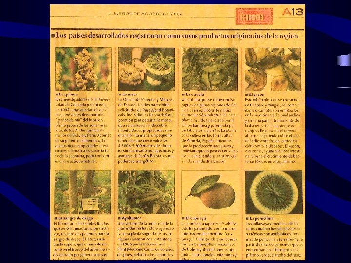 Propiedad Intelectual La propuesta de EE. UU. • Artículo 8 Patentes – 2. Cada Parte (país) debe hacer disponibles las patentes para los siguientes inventos: – (a) Plantas y animales, y – (b) diagnósticos, terápias y procedimientos quirúrgicos para el tratamiento de humanos o animales.