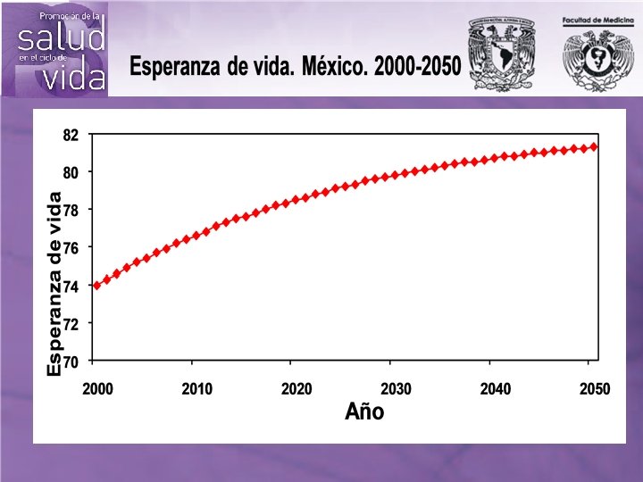 Esperanza de vida • Mientras que los niños que nacieron en 1930 vivieron en promedio 34 años, quienes nacieron en el último decenio del siglo XX y el primero del XXI vivirán en promedio 75 años, o sea más del doble que ochenta años atrás. • Como resultado, ha existido un progresivo envejecimiento de la población. Hacia 1990, de la población total mexicana el 6. 1% tenía 60 años o más; en el 2009 esa proporción subió al 9. 9% y hacia mediados del siglo XXI se espera sean 31. 2%.
